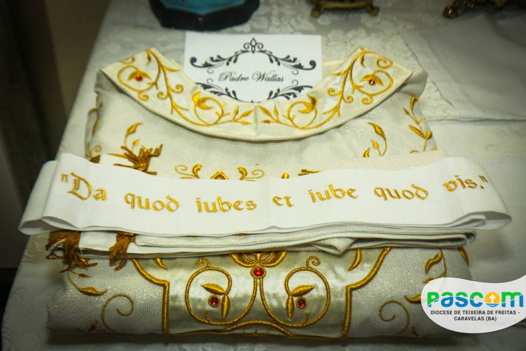 O lema escolhido pelo padre Wallas para o seu sacerdócio foi o trecho da Oração de Santo Agostinho “Da quod iubes et iube quod vis” – Dai-me o que ordenais e ordenais o que quiserdes. Para ele, o lema escolhido vem desde o Seminário. “Nós temos que pedir sempre ao Senhor, que Ele conceda a nós, essa grande graça e com isso, ouvindo a sua palavra é que a gente pede que ele faça, ou que nós possamos fazer o que ele nos pede, para que eu possa cumprir fielmente o seu chamado. Esse sacerdócio como eu disse também nos agradecimentos, é um degastar-se, degastar para que as ovelhas de Cristo possa estar unidas ao seu redil, ouvindo a verdade que é Cristo Jesus“, disse o padre.