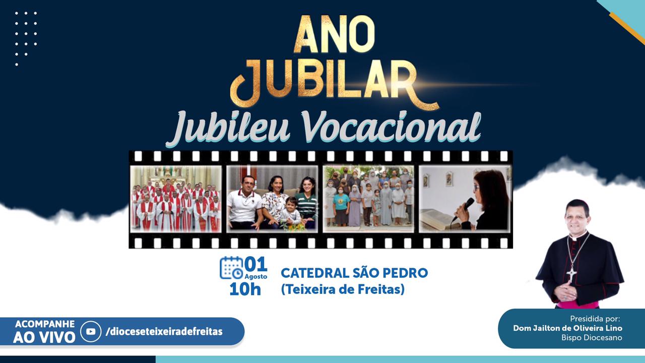 Como parte da programação do Ano Jubilar da Diocese Teixeira de Freitas – Caravelas/Ba, acontecerá no próximo domingo, dia 01/08/2021, o Jubileu Vocacional, com uma Celebração Eucarística presidida pelo Reverendíssimo Excelentíssimo Bispo Diocesano Dom Jailton de Oliveira Lino às 10h na Catedral Diocesana em Teixeira de Freitas.