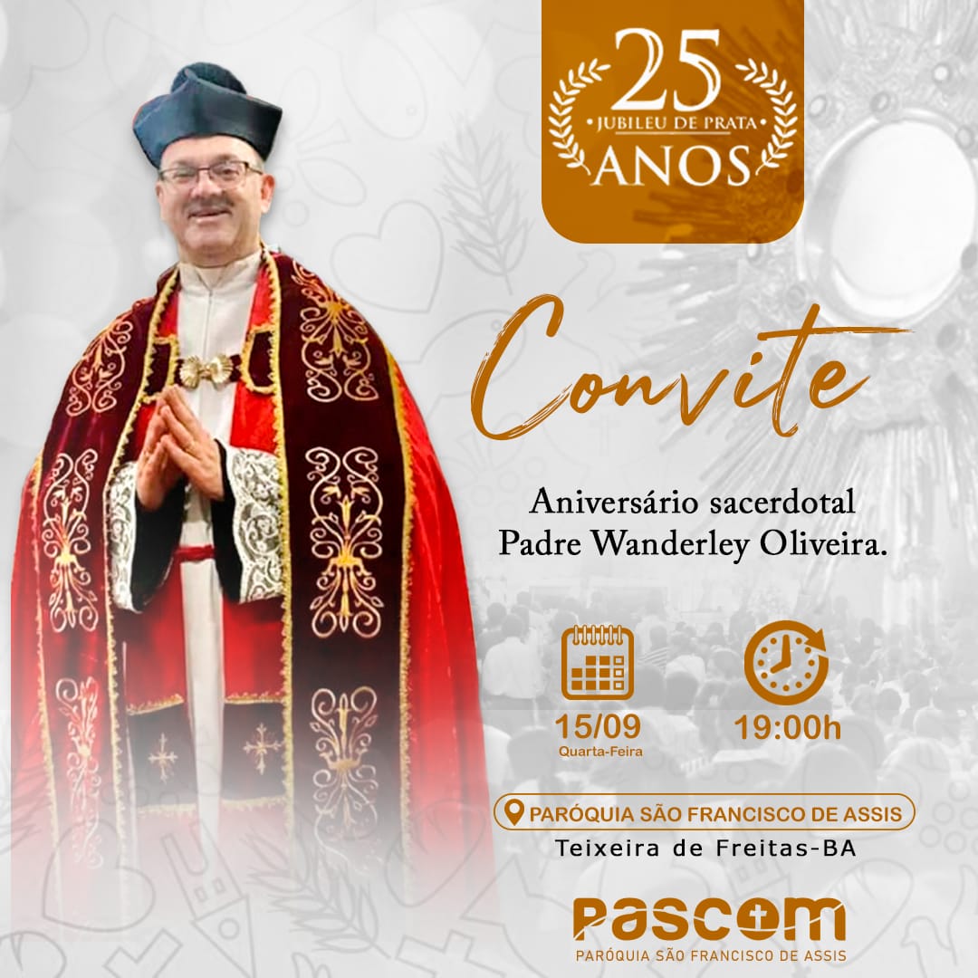 Jubileu de Prata são 25 anos e para celebrar este tempo de ação de graças, o Pe. Wanderley da Silva Oliveira, atualmente como pároco da Paróquia São Francisco de Assis em Teixeira de Freitas, convida todos para participarem desta data tão importante com uma Missa, que acontecerá no dia 15 de setembro (quarta-feira), às 19h, na Igreja Matriz. A Celebração Eucarística contará com a presença de padres amigos. Continuando o Jubileu, o padre ainda celebrará no dia 18 de setembro, às 19h, mais uma Missa, desta vez em Medeiros Neto, na Comunidade Nossa Senhora Aparecida.