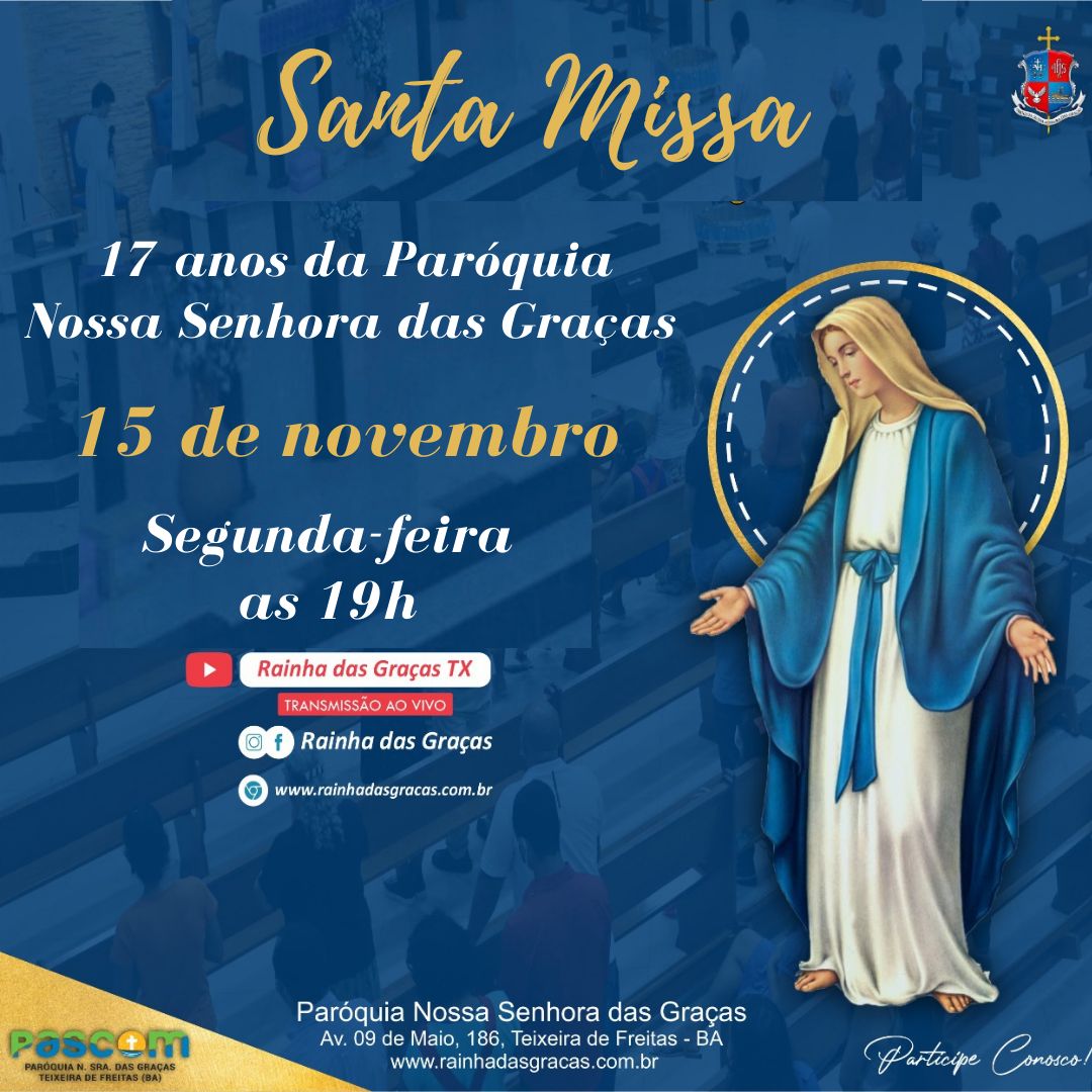 Em comemoração aos 17 anos de fundação da paróquia Nossa Senhora das Graças, em Teixeira de Freitas, será realizada nesta segunda-feira (15), às 19h , uma Missa festiva , que será presidida pelo Vigário Geral, Pe. Paulo Santos Sales e concelebrada pelo Pe. Jaelson Cerqueira Santos.