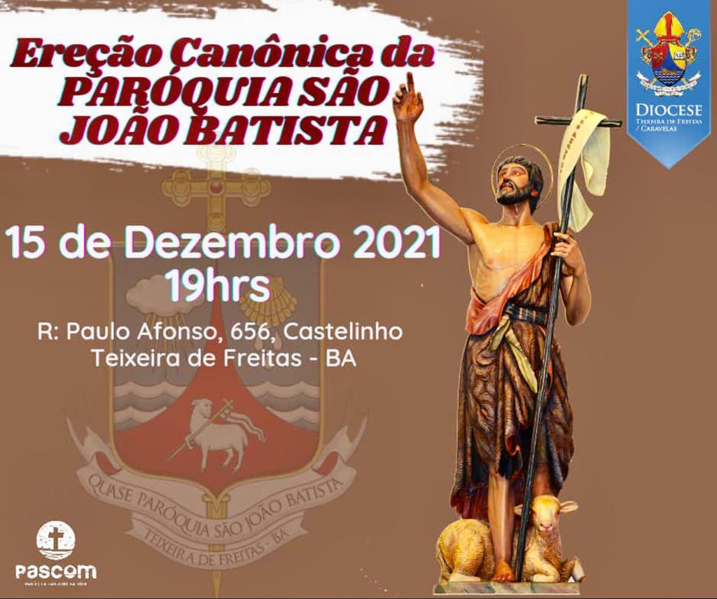 A quase-paróquia São João Batista em Teixeira de Freitas será elevada à paróquia nesta quarta-feira (15), às 19hrs, em uma Celebração Eucarística presidida por nosso Bispo Diocesano Dom Jailton de Oliveira Lino, psdp.