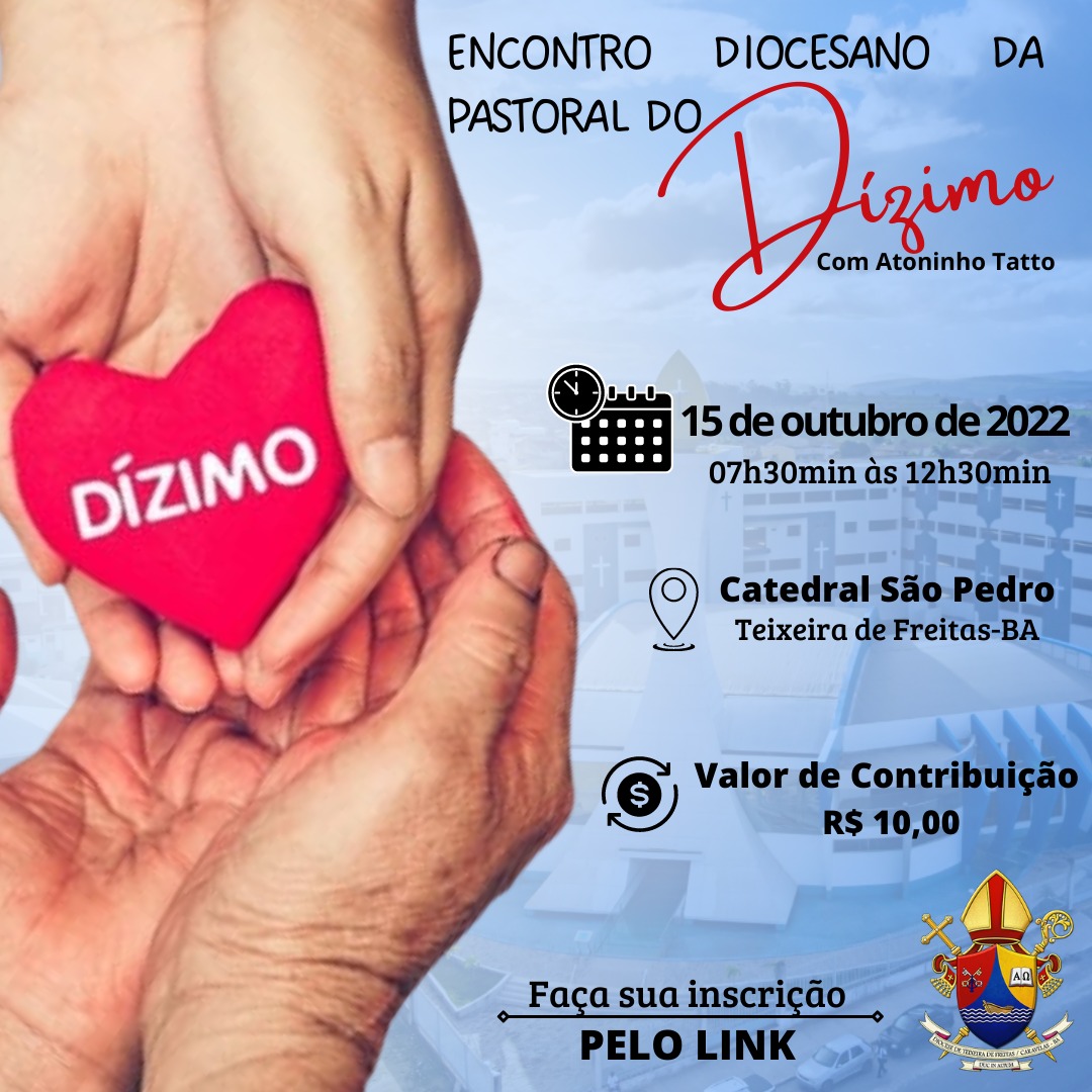 A Coordenadora da Pastoral do Dízimo, Regina Fachetti, e o Assessor Diocesano do Dízimo, Pe. José Ailton Ribeiro Pardinho, convidam os Padres, Diáconos, Religiosos(as), membros da Pastoral do Dizimo e todos coordenadores de Pastorais e Movimentos para participarem do Encontro de Formação da Pastoral Diocesana do Dizimo, que será realizado no dia 15 de Outubro de 2022, das 07h 30min às 12h 30min, na Catedral São Pedro em Teixeira de Freitas – BA. Teremos como ministrante desse encontro o nosso querido irmão Missionário, Antoninho João Tatto Primo – Instituto MEAC São Paulo Apóstolo –