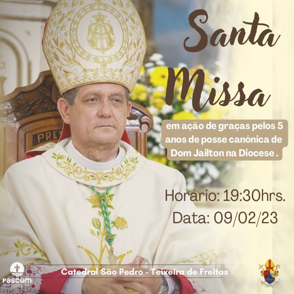 A Diocese de Teixeira de Freitas – Caravelas convida toda a comunidade para participar da Missa em ação de graças pelos 5 anos de Posse Canônica de Dom Jailton de Oliveira Lino, psdp, como bispo da Diocese de Teixeira de Freitas – Caravelas que será realizada na próxima quinta-feira, 09 de fevereiro de 2023, às 19h30, na Catedral São Pedro situada na cidade de Teixeira de Freitas – BA.