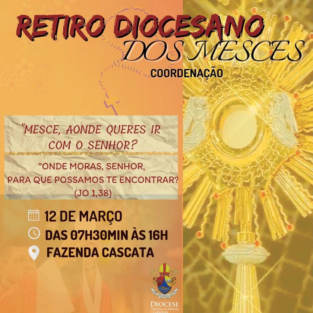 Acontecerá no dia 12 de Março de 2023, das 7h 30 às 16h, na Fazenda Cascata, o Retiro Diocesano dos MESCES. O retiro está sendo organizado e será realizado pela Coordenação Diocesana dos MESCES.