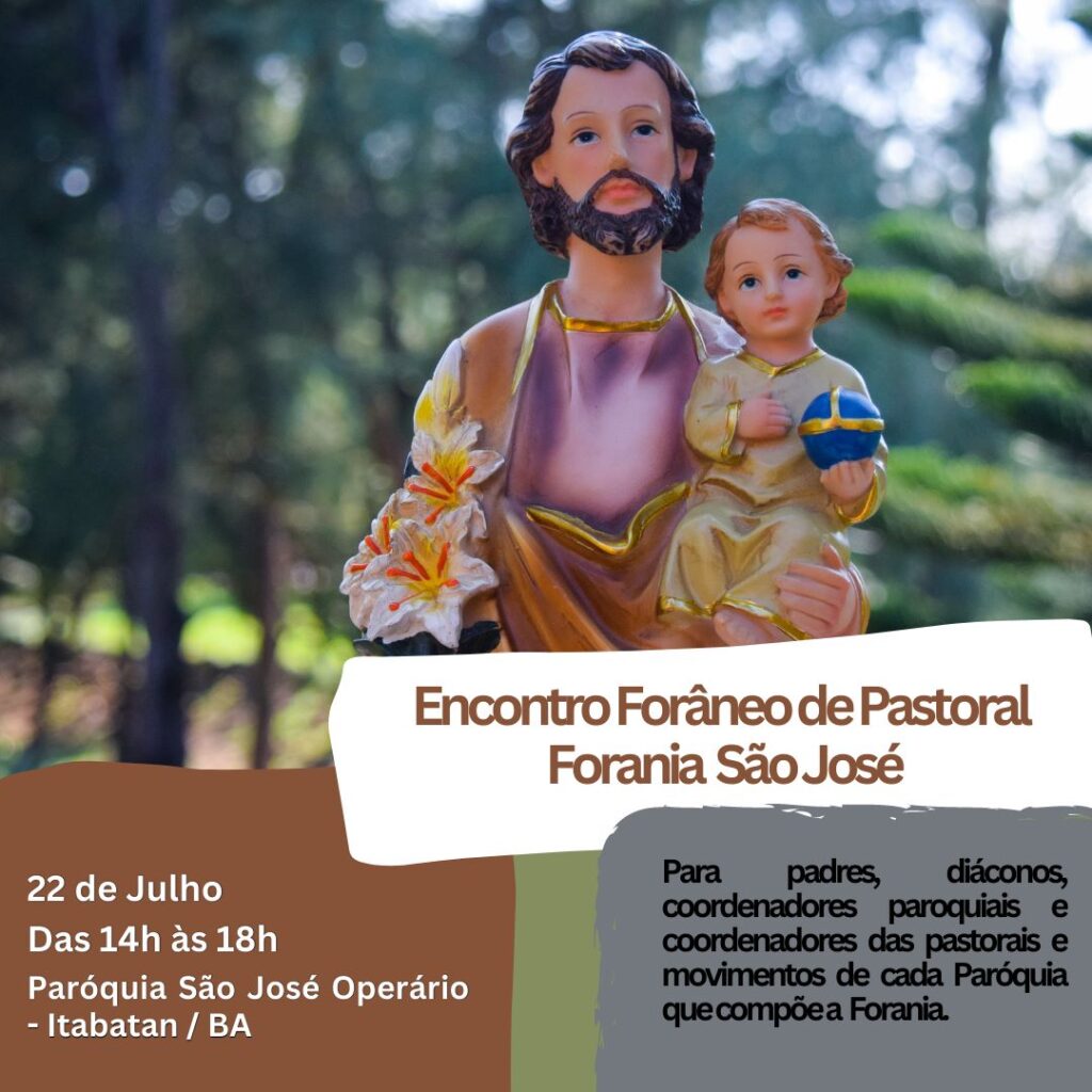 Acontecerá no sábado, dia 22 de Julho de 2023, das 14h às 18h, na Paróquia São José Operário em Itabatan – BA, o encontro Forâneo de Pastoral da Forania São José. O encontro, que está sendo organizado pela Coordenação Diocesana de Pastoral, é para padres, diáconos, coordenadores paroquiais, e coordenadores das pastorais e movimentos de cada paróquia que compõe a Forania.