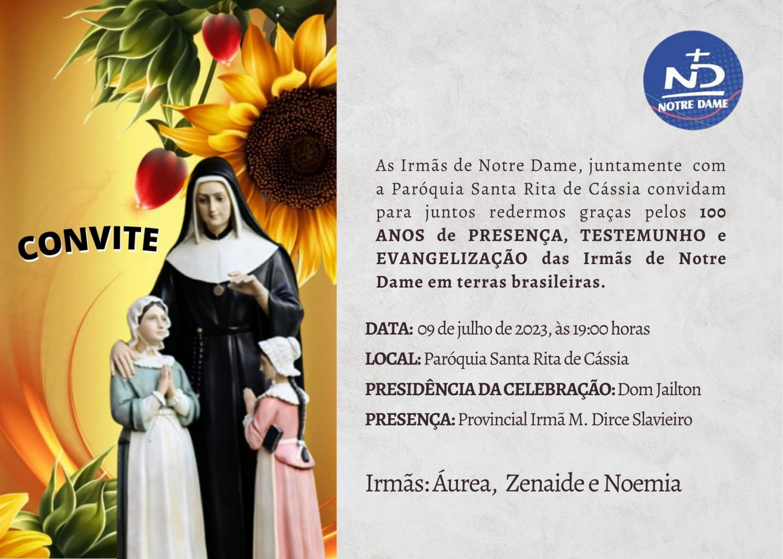 As Irmãs de Notre Dame, juntamente com a Paróquia Santa Rita de Cássia convidam para juntos rendermos graças pelos 100 anos de Presença, Testemunho e Evangelização das Irmãs de Notre Dame em terras brasileiras.