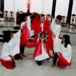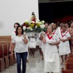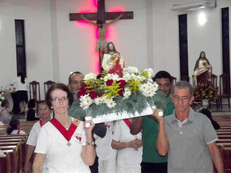 Padre Ronaldo em sua homilia, destaca as 12 promessas do Sagrado Coração de Jesus a Santa Margarida Maria Alacoque, seu designo e riqueza para quem adere a devoção de modo especial ao Sacratíssimo coração de Jesus. Após a homilia foi aprestado quatro novos membros do Movimento do Apostolado da Oração que receberam suas respectivas fitas se consagrando com a benção do pároco.