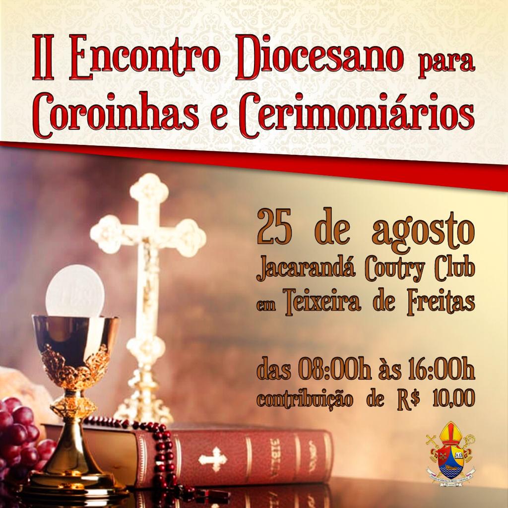 Estão abertas as inscrições para o II Encontro Diocesano de Coroinhas e Cerimoniários promovido pela diocese. O encontro acontecerá no dia 25 de agosto, com início às 08h com acolhida e credenciamento no Jacarandá Country Club, em Teixeira de Freitas.