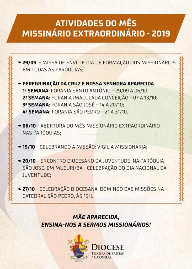 O Conselho Missionário Diocesano (COMIDI) e a Coordenação Diocesana de Pastoral prepararam um mês cercado de intensas atividades na diocese. No dia 29/09, com a celebração da Santa Missa de envio dos missionários em toda as paróquias, dia 06/10, abertura do Mês Missionário também nas paróquias. No dia 19/10, será realizada em cada igreja a Vigília Missionária a partir das 19h e, para finalizar a missão uma celebração diocesana, no último domingo do mês – dia 27/10, Domingo das missões, a ser celebrada na Catedral São Pedro, às 15h.